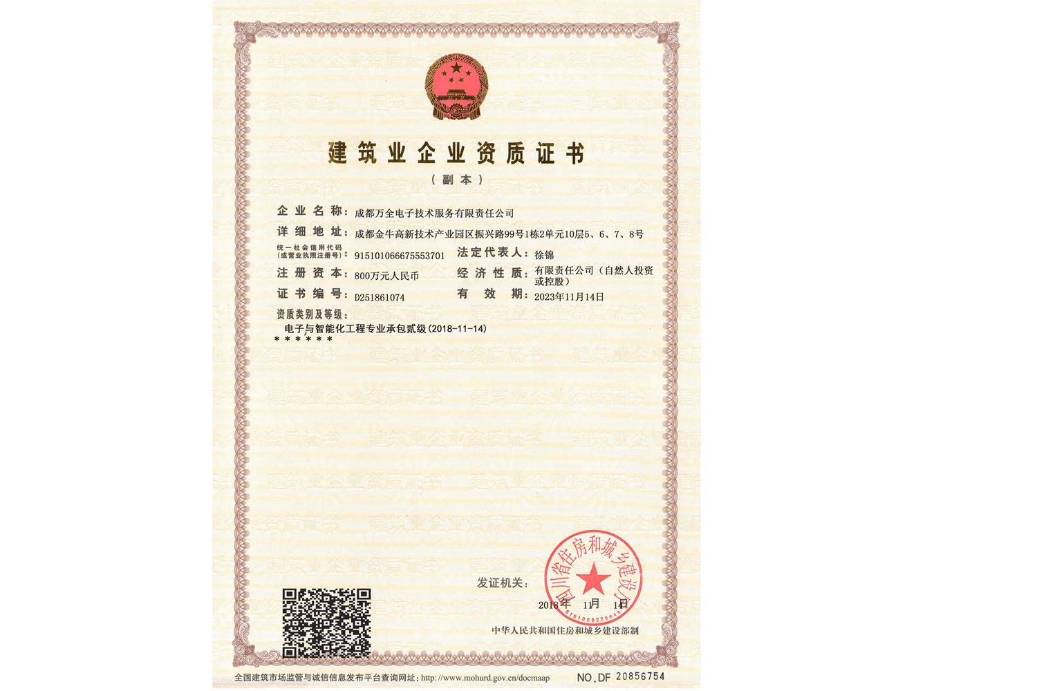 2018年11月安防工程公司成都萬全電子取得《電子與智能化工程專業(yè)承包貳級》資質